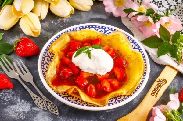 Прогрейте блины в микроволновой печи, чтобы они слегка поднялись по краям либо просто выложите их на тарелку. Вылейте ягодно-карамельную массу в середину.