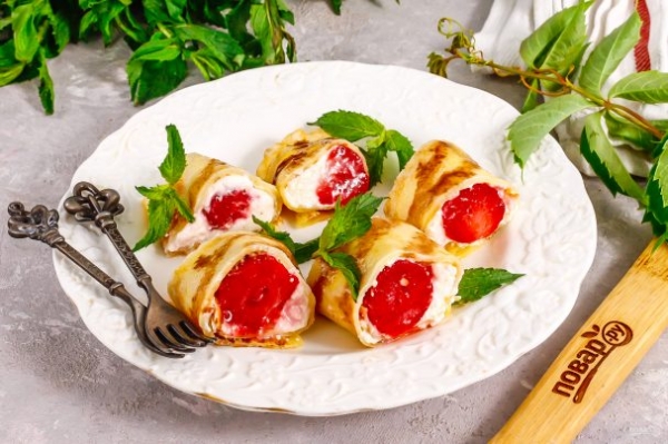 Десертные блинные роллы можно готовить с любыми ягодами или мягким сыром. Чтобы начинка была плотнее, заранее охладите творожный или плавленый сладкий сыр в холодильнике. Блины можно испечь шоколадные или ванильные.