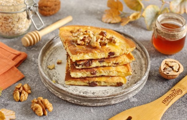 Я подавала блюдо с медом и грецкими орехами, но вы можете использовать в качестве топпинга любой легкий крем, растопленный шоколад, арахисовую пасту или просто любые свежие ягоды или фрукты. Готовится все очень просто и не отнимет много времени. Попробуйте!