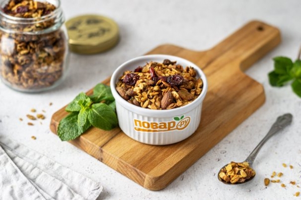 Ниже я расскажу подробнее, как приготовить домашнюю гранолу. Овсяные хлопья выбирайте длительного (10-15 минут) приготовления. Вместо сиропа топинамбура можно взять любой другой жидкий подсластитель. Яблочный сок можно заменить на апельсиновый. Арахисовую пасту выбирайте жидкую, кремовой консистенции, при необходимости ее можно разбавить растительный маслом. Гранола хорошо сочетается с молоком, йогуртом, подойдет в качестве топпинга для десертов.