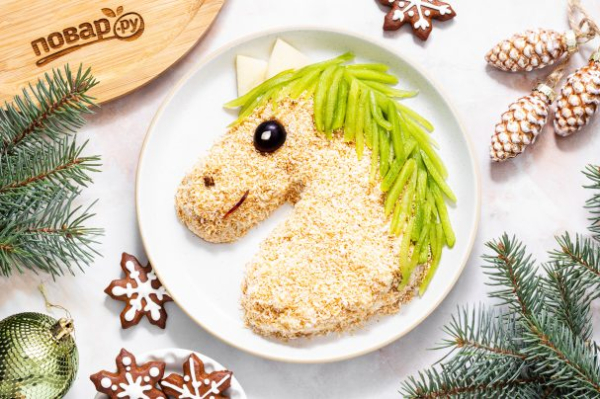 Выложите на сервировочную тарелку салат в форме силуэта головы лошади.