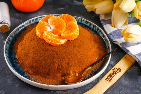 Перед подачей накройте емкость тарелкой и переверните дном вверх. Потяните за края пищевой пленки и торт упадет прямо на тарелку. Удалите пищевую пленку. Присыпьте десерт какао-порошком или кокосовой стружкой, это не принципиально. Подайте к столу охлажденным.