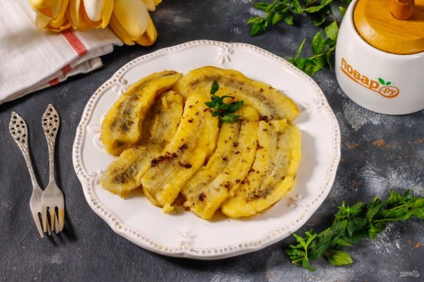 Выложите жареные бананы на тарелку и присыпьте щепоткой корицы, это по желанию. Можно полить шоколадным топингом, сиропом. Подайте блюдо к столу.