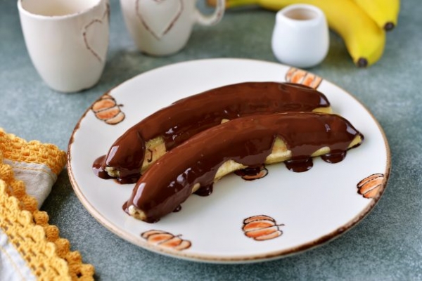 Переложите бананы на блюдо, в котором планируете их подавать, полейте растопленным шоколадом.