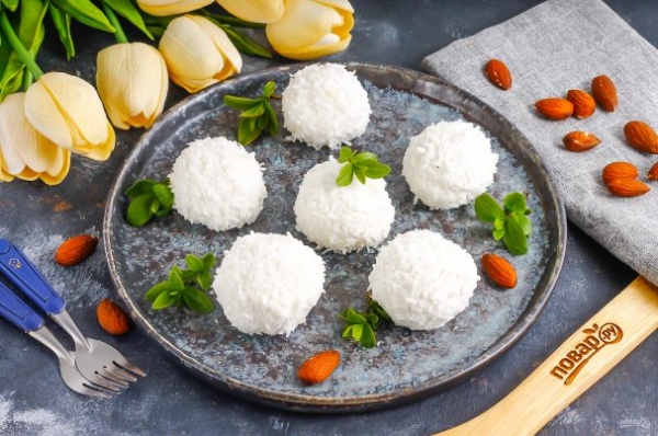 Творожное рафаэлло ничем не уступает по вкусу магазинному варианту, но получается более сытным и полезным. Миндаль можно добавить в середину десерта или измельчить и вмешать в творог. Кокосовую стружку можно приобрести любого цвета.