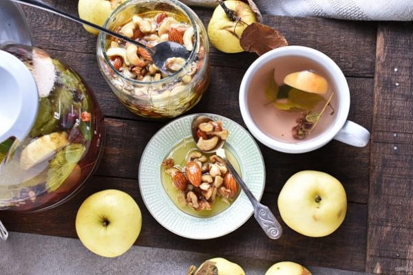 Орехи можете брать любые по вашему вкусу, как и мед. Единственное условие – мед должен быть жидким, чтобы покрыть орехи без нагревания, для сохранения полезных веществ.