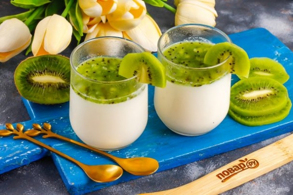 Десерт подают к столу охлажденным, он идеален в летний зной, когда так хочется чего-нибудь прохладного и освежающего, но не слишком сладкого. Киви выбирайте спелый, он должен быть слегка мягким при надавливании.