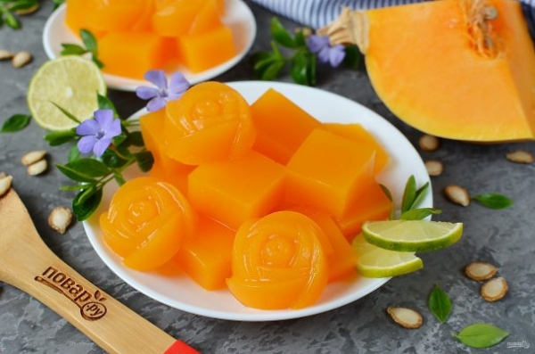 Пока масса для десерта горячая, она не застынет, это очень удобно, если вы не успеваете приготовить формы. Лучший вариант — стекло или силиконовая. Десерт можно приготовить без сахара, просто замените его медом, а вот агар-агар ничем заменять нельзя, с желатином вкус будет другой, но форму держать он будет только при хранении в холодильнике. Если тыква очень сочная, то количество воды можно немного уменьшить.
