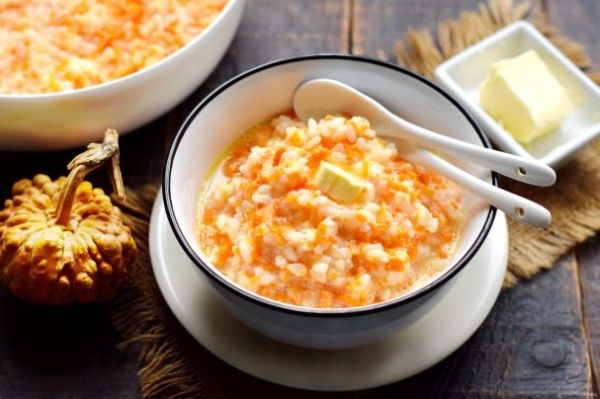 Рисовую кашу с тыквой можно назвать идеальным сбалансированным завтраком или ужином, который наполнит организм витаминами, а также утолит чувство голода. Тыквенную кашу готовим с рисом, который сначала варим на воде, лишь потом добавляем молоко и измельченную тыкву. Тыкву можно натереть на терке или нарезать небольшими кусочками. Яркая тыквенная мякоть делает блюдо очень ярким и аппетитным. Каша по данному рецепту имеет идеальную густоту, очень нежный, в меру сладкий сливочный вкус.