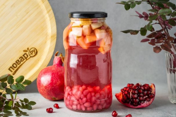 Ниже я расскажу подробнее, как приготовить компот из граната на зиму. Рецепт рассчитан на литровую банку. Компот можно готовить только на основе граната, но на вкус он получается более резким и терпким. Вместо яблока его можно разбавить грушей или ягодами.