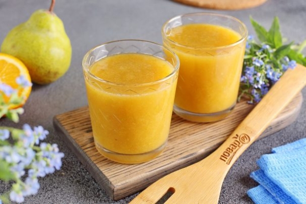 Вторую половину очистите от шкурки и пленок и переложите подготовленную мякоть в чашу блендера. Добавьте сюда же нарезанную кусочками спелую грушу.