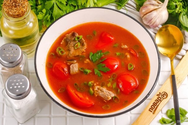 Китайский суп готовится из половинок томатов и мякоти говядины. Вы можете добавить в него взбитые куриные яйца, создавая наподобие омлета, но это — по желанию. Если готовите блюдо и для детей, то замените острый соус на томатную пасту.