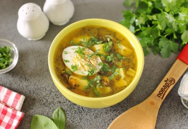 Готовый щавелевый суп украсьте половинкой вареного яйца по желанию и зеленью. Можно добавить сметану. Приятного аппетита!