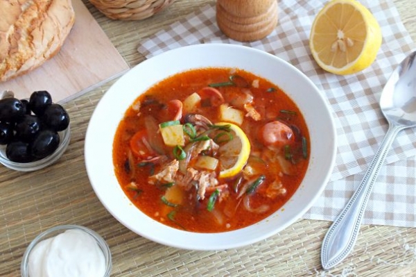 Как известно, в солянку картофель не добавляют. В предлагаемом рецепте можно добавить по вкусу или же опустить этот пункт. Суп получается достаточно густым. Также вы можете заменить черные оливки на зеленые. Выбирайте по вкусу!