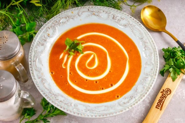 Протрите массу через ситечко и перелейте в тарелки, подайте к столу суп теплым, украсив паутинкой из сметаны или майонеза.