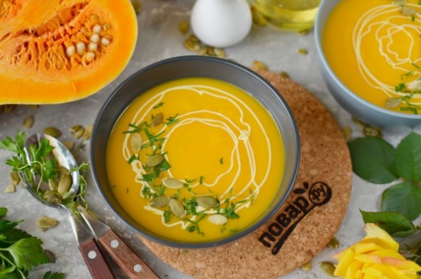 Этот тыквенный суп для похудения не менее вкусен, чем классический, но заметно менее калорийный, потому что сливки заменены водой, а сливочное масло на растительное.