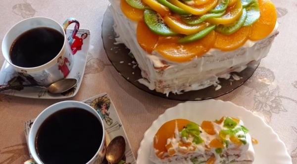 Я сделала 3 слоя. Коржи смазываем взбитыми сливками и кладём порезанные фрукты. Сверху следующий слой. Верх смазываем полностью сливками и украшаем фруктами.