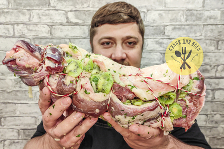Баранью ногу необходимо разделать. Мясник на рынке самостоятельно вырезал лимфоузел. Я лишь аккуратно по кости цельным куском вырезал мякоть, таким образом чтобы у нас была цельная кость и отдельно мякоть. Солим по вкусу мякоть со всех сторон.