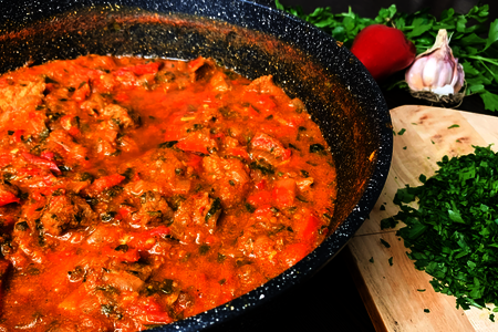 Затем добавляем томатную пасту, аджику, помидоры и все специи, тушим ещё 15 минут.