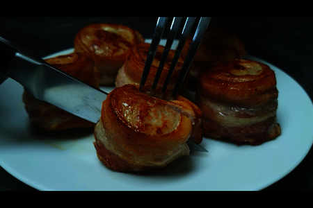 Обернуть полоской бекона и скрепить зубочисткой, чтобы сохранить форму медальонов.