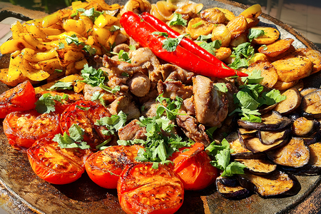В центр саджа выкладываем баранину. Далее секторами. Жареный лук. Картофель. Баклажаны. Помидоры. Сладкие болгарские. И острые чили перцы. Присыпаем кинзой и подаём на стол. Приятного аппетита!