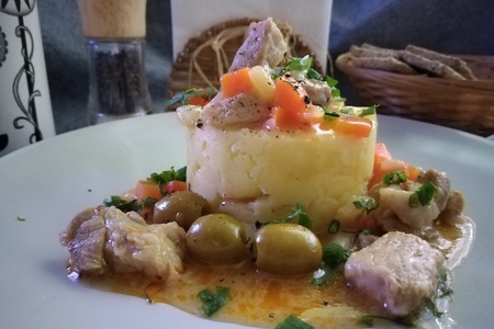13. На гарнир я сделала мятую картошку со сливочным маслом. Почему-то поджарку очень люблю именно с пюре картофельным. Выложила его в кольцо, добавила поджарку, поперчила свежемолотым чёрным перцем и присыпала зеленью немного.
