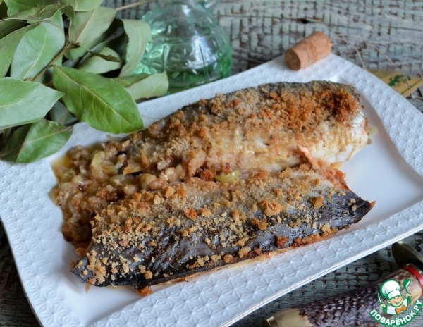Накрыть вторым филе, сверху соль, перец, сухари. Полить оливковым маслом, отправить в разогретую духовку.