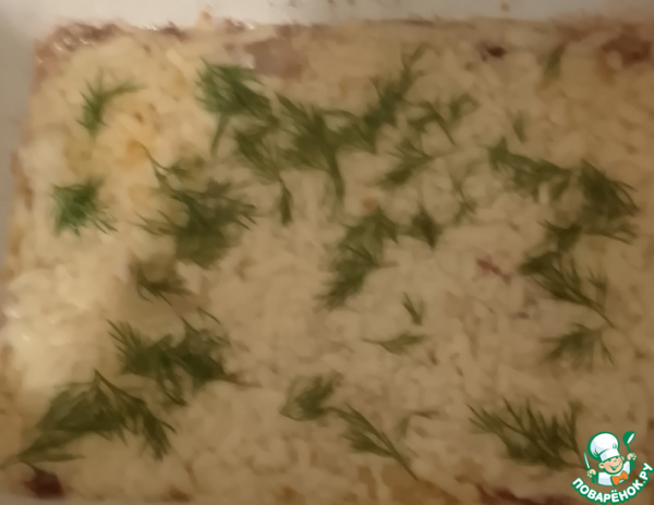 Поливаем кокосовым соусом. Наверх выкладываем картофельную смесь. Посыпаем любимой зеленью. У меня укроп.