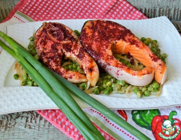 Рецепт «Лосось-гриль со сливочным зелёным горошком»: