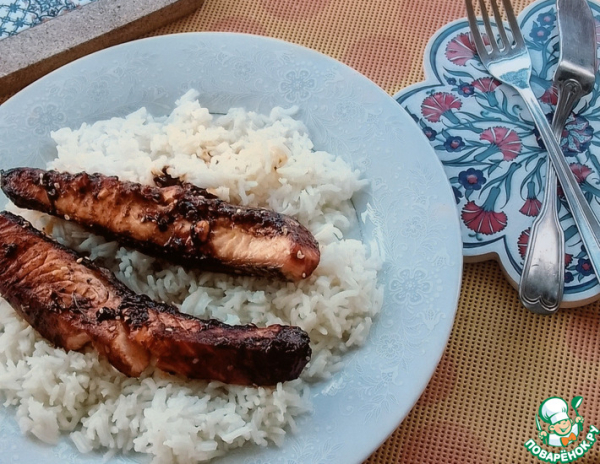Вынуть ёмкость для запекания из духовки. Выложить филе лосося с его соусом поверх риса. Можно подавать с арахисом по желанию. Приятного аппетита.