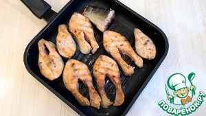 Горбушу почистить, удалить плавники, нарезать на порционные кусочки. Горбушу присолить, добавить по вкусу соль и черный молотый перец.