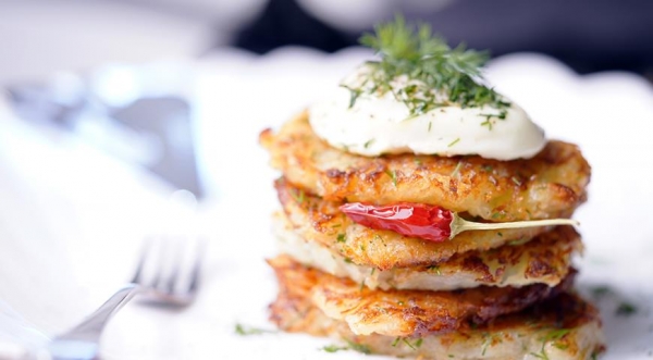 Подать, положив на драники сверху яйцо пашот, посыпать рубленой зеленью.