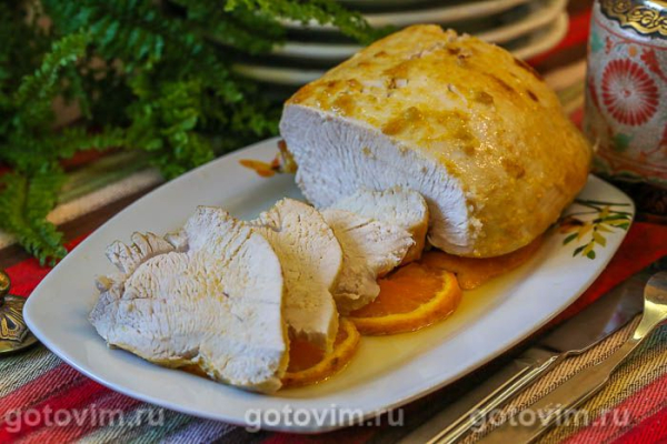 Спустя указанное время, аккуратно надрезать рукав для запекания, освободив верх филе индейки, и оставить еще на несколько минут, чтобы мясо слегка подрумянилось. Проверить готовность индейки, проткнув в самой толстой части мясного куска тонким ножом: если вытекает прозрачный сок, филе готово. Переложить запеченное мясо на тарелку, прикрыть фольгой и дать отдохнуть. В моей духовке килограммовый кусок филе был готов через час, но вы ориентируйтесь на свою духовку, чтобы случайно не пересушить или недопечь индейку. Порезать филе индейки в апельсиновом маринаде порционными ломтиками и подавать к столу с гарниром по вкусу. Приятного аппетита!
