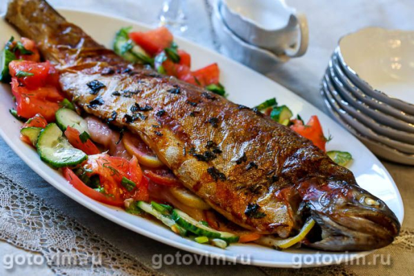 Форель вымыть, почистить, вырезать жабры и срезать плавники (хвостовой можно оставить). Затем аккуратно, стараясь не задеть желчный пузырь, вскрыть брюшко рыбы и осторожно удалить внутренности. Еще раз промыть рыбу холодной водой, обсушить бумажным полотенцем. Натереть солью снаружи и внутри.