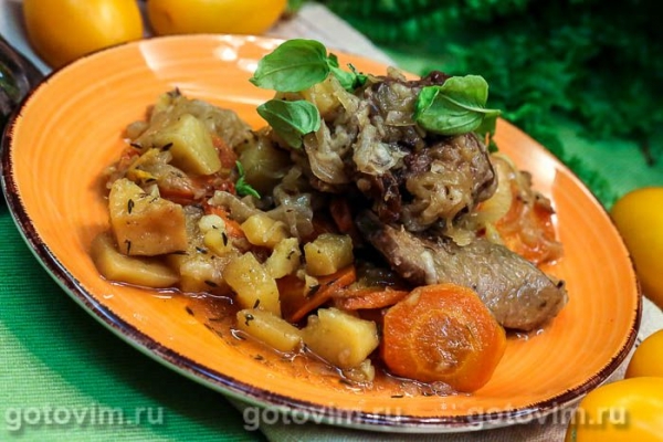 Говяжья грудинка с картофелем пропекается и становится очень мягкой, если её на 2 с лишним часа отправить в прогретую до 180С духовку. За это время в горшочке для запекания образуется вкуснейший соус, который обязательно добавьте в тарелку вместе с рагу.