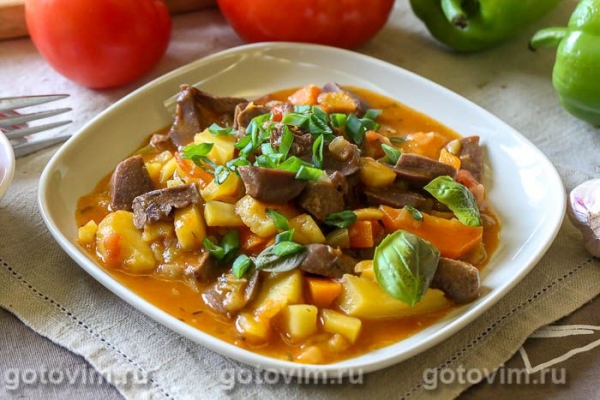 Для этого гуляша я взяла полкило очищенных утиных желудков. Можно сразу отправить их в посуду, в которой планируете готовить гуляш, но лучше сварить их заранее в отдельной кастрюле и добавлять к сосательным ингредиентам уже в практически готовом виде. Почему лучше? Потому что не только быстрее приготовите обед, но и сделаете его вкуснее. Сваренные и нарезанные ломтиками утиные желудки будут томиться в кастрюле с овощами и лучше пропитаются образовавшимся в кастрюле соусом. Вам останется только разложить готовый гуляш по тарелкам и подавать его с ломтиком хрустящего хлеба.