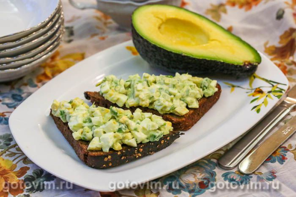 Полезный, сытный салат из авокадо с вареными яйцами можно подавать на ломтиках поджаренного хлеба — белого или черного. В зависимости от вкусовых предпочтений для заправки возьмите майонез, сметану или йогурт. Вместо репчатого лука подойдет молодой зеленый или исключите лук совсем, заменив его свежей зеленью. В этом случае яичный салат будет мягче на вкус.