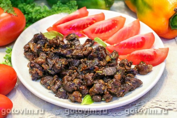 Разогреть глубокую сковороду с толстым дном и выложить кусочки сердца. Обжаривать, периодически помешивая, пока не выпарится почти вся жидкость.