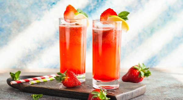 В получившуюся смесь добавьте по желанию лед и 50 мл апельсинового сока, перемешайте и сверху налейте 150 мл содовой или минеральной воды. Украсьте долькой клубники и листиками мяты. Клубничный мохито подавайте с трубочками для коктейля.