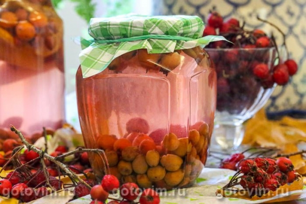 Из спелых ягод боярышника готовят ароматный компот нежного розового цвета. Вкус боярышника яркий, своеобразный, но долька лимона или щепотка лимонной кислоты сделает компот еще вкуснее. Его можно выпить сразу или заготовить на зиму. Дозировка продуктов дана на трехлитровую банку напитка.