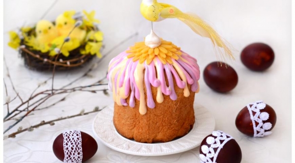Разделить глазурь на 3-4 части. Одну часть оставить белой, в другие добавить красители. Аккуратно перемешать спатулой до однородности цвета каждую глазурь. При помощи корнетика украсить кулич глазурью, имитируя цветок.