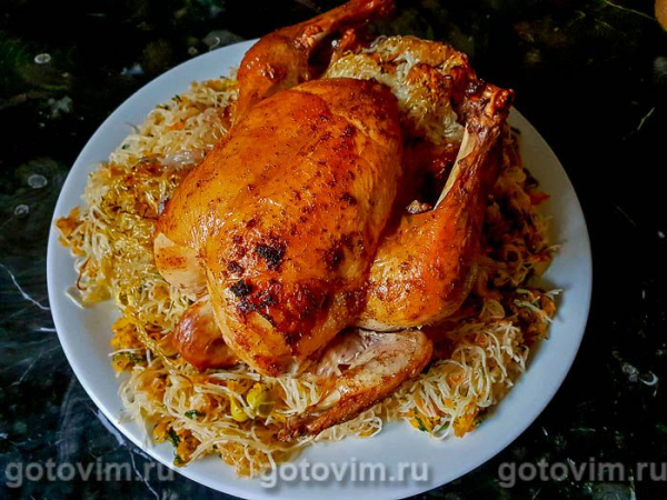 Курица, фаршированная рисовой лапшой, морковью и оливками