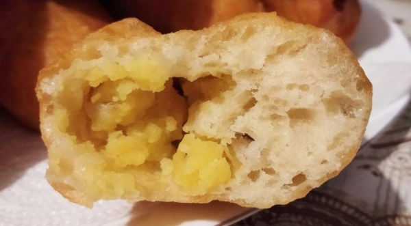 По очереди каждый колобок разминаем в продолговатую лепешку. На один узкий край кладём начинку и сворачиваем рулетом, бока чуть прищипнуть.