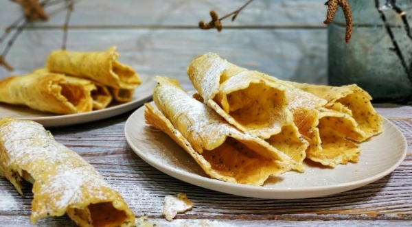 Горячие постные вафли сверните в трубочку. Дайте им остыть, примерно 15 мин, чтобы они стали хрустящие и рассыпчатые. Посыпьте их сахарной пудрой и подавайте к столу.
