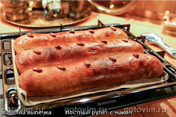 Когда тесто будет готово, раскатать на столе несколько тонких продолговатых кружков, намазать маковой массой, свернуть в трубку и, чтобы концы были ровные, сложить на лист, намазанный прованским маслом и посыпанный мукой, намазать тесто медом, размешанным с водой, посыпать маком или сладким миндалем, вставить в печь на 3/4 часа.