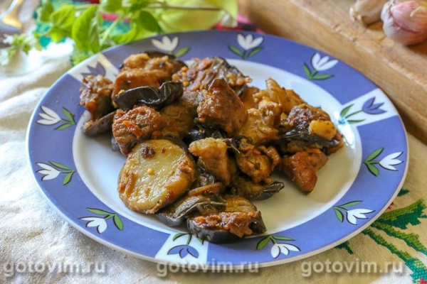 Рагу из свинины с жареными баклажанами и картофелем в соевом соусе