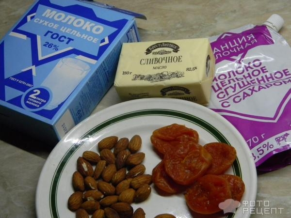 Для этого понадобится сухое молоко, сгущенное молоко, любые орешки, сливочное масло, сухофрукты и щепотка винили.
