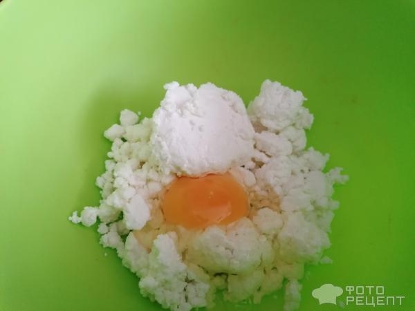 Творог выложила в глубокую чашу, добавила яйцо.