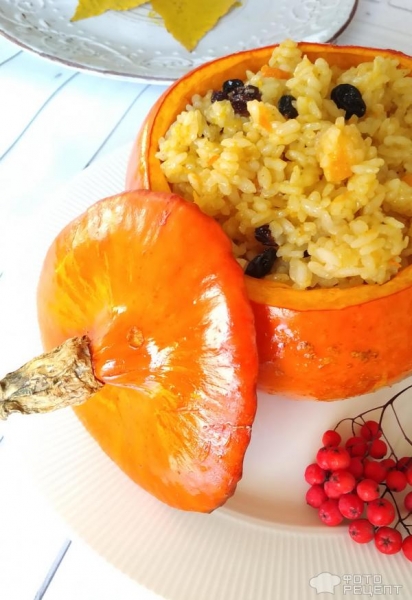 Рецепт: Фаршированная тыква — «Горшочек», вари! Самая «правильная» рисовая каша с изюмом, медом и корицей.