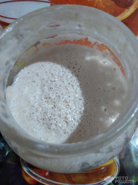 Добавляю в закваску одну горсть муки пшеничной, и добавляю в смесь очищенной водички по количеству так, чтобы будущее тесто было сейчас, как сметана по консистенции.
